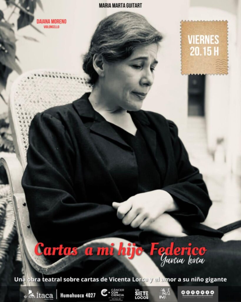 Les cuento que el viernes a las 20 horas está la obra “Cartas a mi hijo Federico” de María Marta Guitart en el Itaca Complejo Teatral de Humahuaca 4027, CABA. Las entradas se consiguen por Alternativa Teatral. Les aviso por si a alguien le interesa.